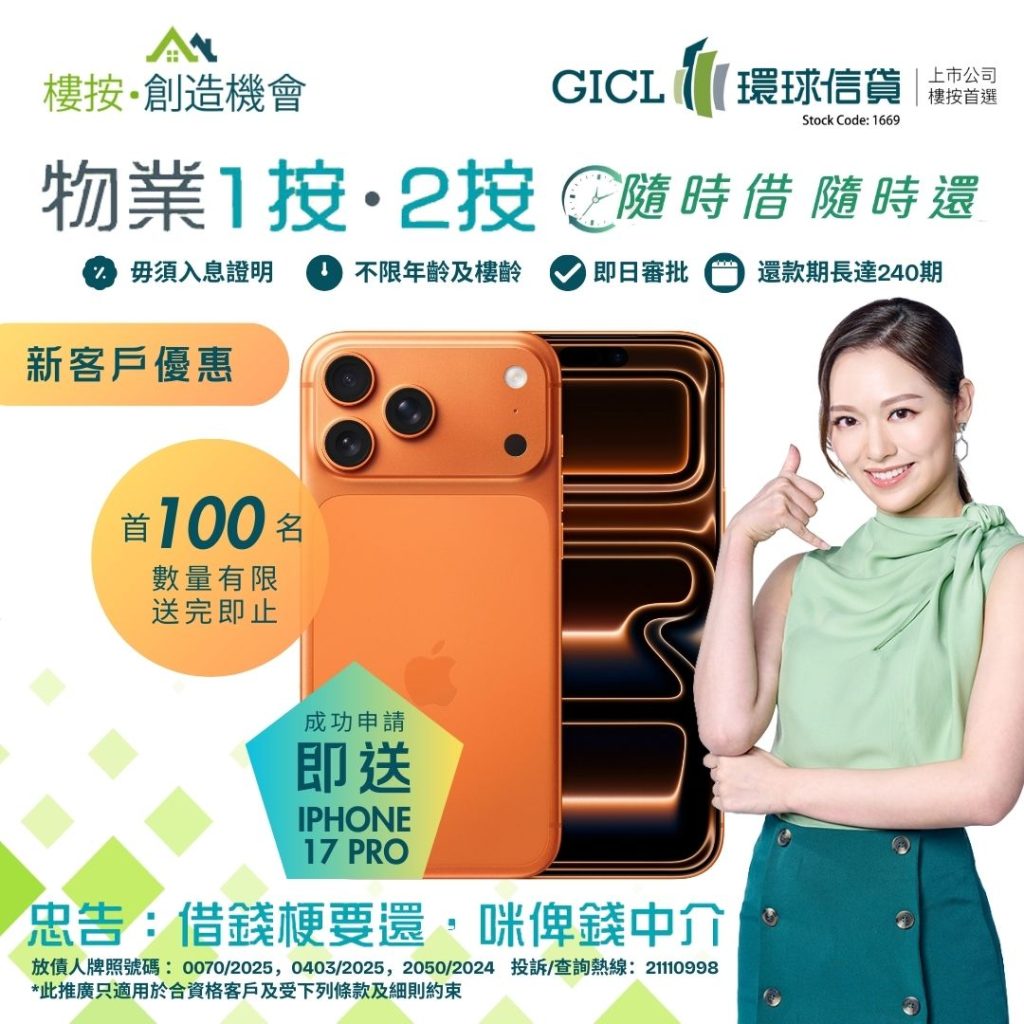 2. 貸款額達港幣100萬元或以上,月息1.18%或以上,方可獲贈iPhone 17 Pro (512GB) 乙部 (價值$11,099)。